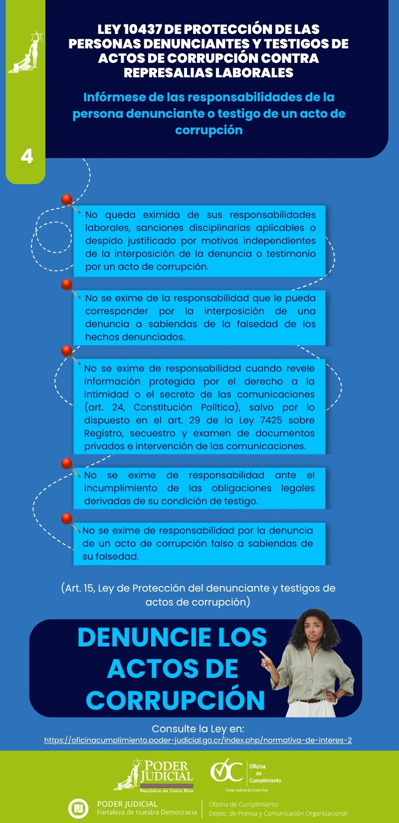 - No queda eximida de sus responsabilidades laborales, sanciones disciplinarias aplicables o despido justificado por motivos independientes de la interposición de la denuncia o testimonio por un acto de corrupción.