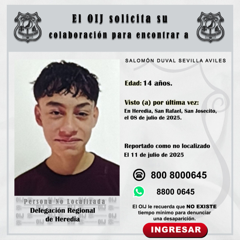 La Delegación Regional de Heredia del Organismo de Investigación Judicial requiere la colaboración de la ciudadanía para ubicar a BRIAN YOSUE GARCÍA FLORES de 14 años y Salomón Duval Sevilla Aviles de 14 años, quienes fueron reportados como No Localizados el 11 de julio de 2025, fueron vistos por última vez en Heredia, San Rafael, San Josecito, el 08 de julio de 2025.