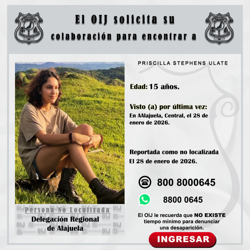 La Delegación Regional de Alajuela del Organismo de Investigación Judicial requiere la colaboración de la ciudadanía para ubicar a PRISCILLA STEPHENS ULATE, de 15 años, quien fue reportada como No Localizada el 28 de enero de 2026, fue vista por última vez en Alajuela, Central, el 28 de enero de 2026. Cualquier información que pueda brindar es indispensable que se comunique al teléfono 800-8000645 o al WhatsApp 8800-0645 del Centro de Información Confidencial.