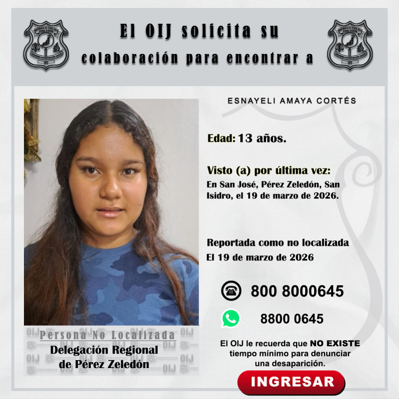 La Delegación Regional de Pérez Zeledón del Organismo de Investigación Judicial requiere la colaboración de la ciudadanía para ubicar a ESNAYELI AMAYA CORTÉS, de 13 años, quien fue reportada como No Localizada el 19 de marzo de 2026, fue vista por última vez en San José, Pérez Zeledón, San Isidro, el 19 de marzo de 2026.