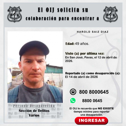 La Sección de Inspecciones Oculares y Recolección de Indicios del Organismo de Investigación Judicial requiere la colaboración de la ciudadanía para ubicar a HAROLD SAIZ DIAZ, de 49 años, quien fue reportado como desaparecido el 14 de abril de 2026, fue visto por última vez en San José, Pavas, el 12 de abril de 2026.