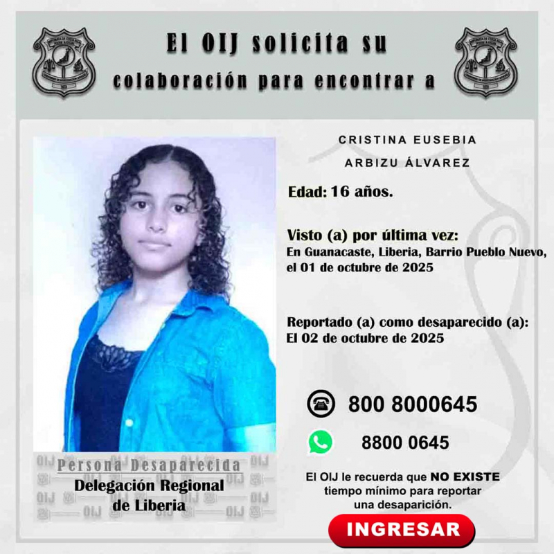 La Delegación Regional de Liberia del Organismo de Investigación Judicial requiere la colaboración de la ciudadanía para ubicar a CRISTINA EUSEBIA ARBIZU ÁLVAREZ, de 16 años, quien fue reportada como desaparecida el 02 de octubre de 2025, fue vista por última vez en Guanacaste, Liberia, Barrio Pueblo Nuevo, el 01 de octubre de 2025.