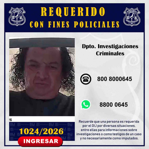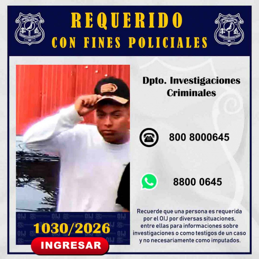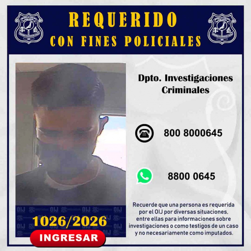 El Departamento de Investigaciones Criminales del Organismo de Investigación Judicial, requiere la colaboración de la ciudadanía para identificar a la persona que se observa en la fotografía, ya que es requerido con fines policiales. Cualquier información que pueda brindar es indispensable que se comunique al teléfono 800-8000645 del Centro de Información Confidencial.