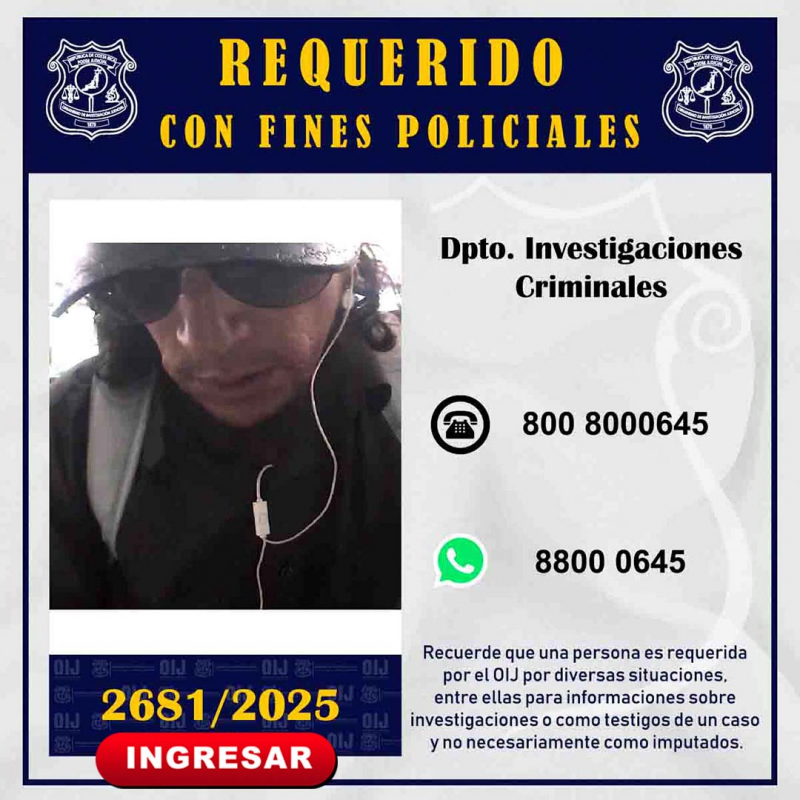 El Departamento de Investigación Criminales del Organismo de Investigación Judicial, requiere la colaboración de la ciudadanía para identificar a la persona que se observa en la fotografía, ya que es requerido con fines policiales. Cualquier información que pueda brindar es indispensable que se comunique al teléfono 800-8000645 del Centro de Información Confidencial.