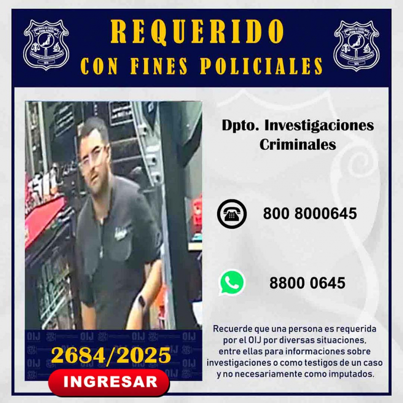 El Departamento de Investigación Criminales del Organismo de Investigación Judicial, requiere la colaboración de la ciudadanía para identificar a la persona que se observa en la fotografía, ya que es requerido con fines policiales. Cualquier información que pueda brindar es indispensable que se comunique al teléfono 800-8000645 del Centro de Información Confidencial.