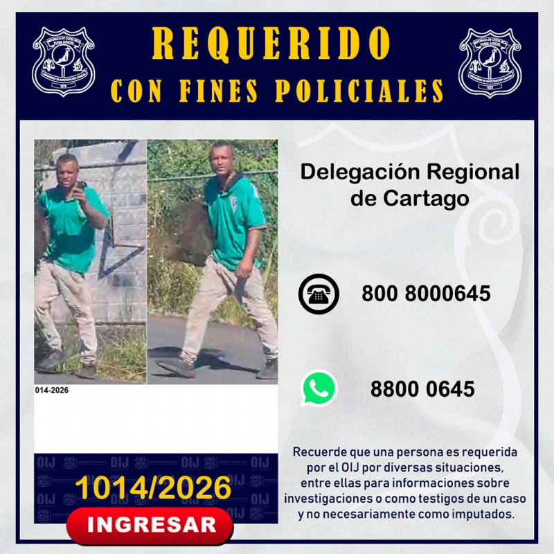La Delegación Regional de Cartago del Organismo de Investigación Judicial, requiere la colaboración de la ciudadanía para identificar a la persona que se observa en la fotografía, ya que es requerido con fines policiales. Cualquier información que pueda brindar es indispensable que se comunique al teléfono 800-8000645 del Centro de Información Confidencial.