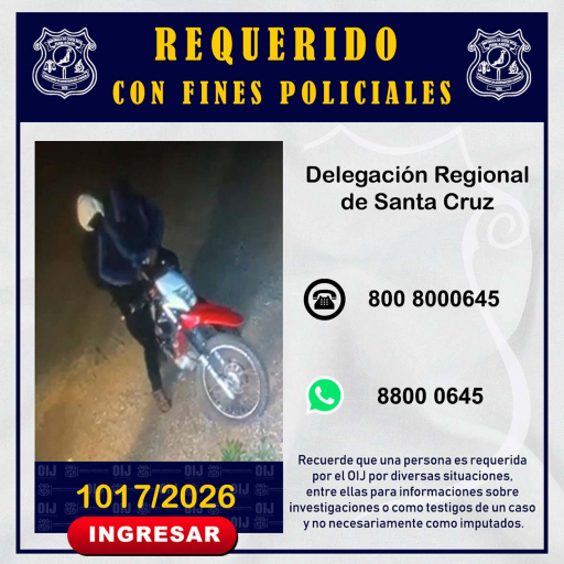 La Delegación Regional de Santa Cruz del Organismo de Investigación Judicial, requiere la colaboración de la ciudadanía para identificar a la persona que se observa en la fotografía, ya que es requerido con fines policiales. Cualquier información que pueda brindar es indispensable que se comunique al teléfono 800-8000645 del Centro de Información Confidencial.